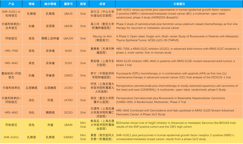 本届大会,作为中国医药创新代表性企业的豪门国际医药共有46项抗肿瘤领域研究成果入围,包括4项最新突破性摘要(LBA)1,共涉及14项创新药。其中9项入选口头(Oral)报告,2项入选简短口头报告(Mini Oral),32项研究接收为壁报(Poster),3项研究接收为电子壁报(E-Poster),覆盖食管胃癌、妇科肿瘤、肝癌、乳腺癌、胰腺癌、肺癌、肉瘤、胆道癌、头颈鳞癌、前列腺癌、甲状腺癌等十余个领域。14款创新药包括10款已上市产品:注射用瑞康曲妥珠单抗(艾维达®,研发代号:SHR-A1811)、注射用卡瑞利珠单抗(艾瑞卡®)、苹果酸法米替尼胶囊(艾比特®)、甲磺酸阿帕替尼片(艾坦®)、马来酸吡咯替尼片(艾瑞妮®)、阿得贝利单抗注射液(艾瑞利®)、羟乙磺酸达尔西利片(艾瑞康®)、氟唑帕利胶囊(艾瑞颐®)、瑞维鲁胺片(艾瑞恩®)、海曲泊帕乙醇胺片(恒曲®),以及4款未上市产品,包括KRASG12C抑制剂HRS-7058、KRASG12D抑制剂HRS-4642、抗PD-L1/TGF-βRII双抗瑞拉芙普-α注射液(SHR-1701)、Trop-2 ADC SHR-A1921。2类新药盐酸伊立替康脂质体注射液(II)(越优力®)及国内首仿药昂丹司琼口溶膜(艾其速®)各有1项研究入选。
